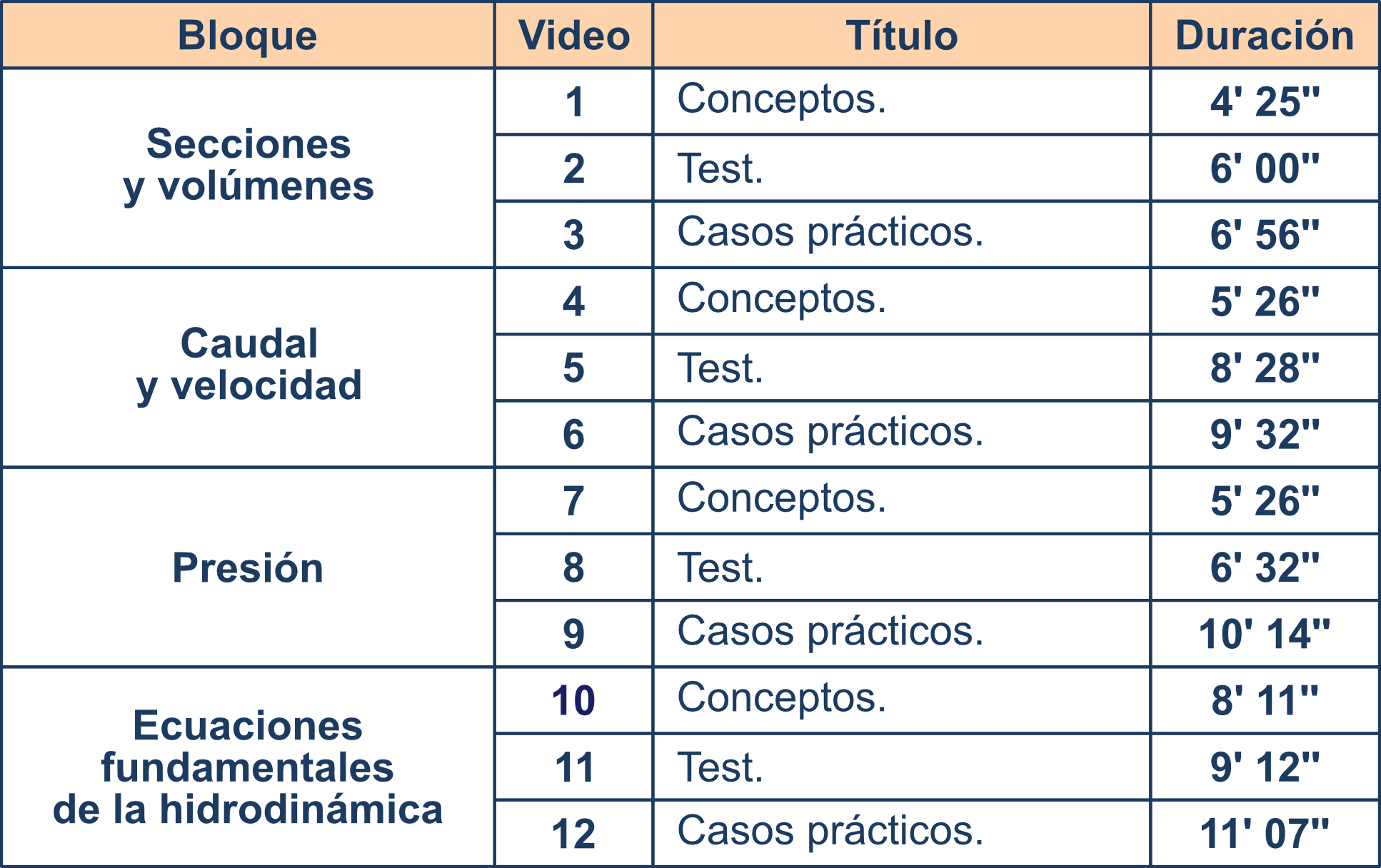 El curso de Hidrodinámica I se estructura en 4 bloques, cada uno de ellos con 3 videos, uno centrado en la teoría, otro en la practica de tipo test y otro en práctica de problemas o casos prácticos. Especial mención a la importancia de éstos últimos, sin duda, serán los que te harán asimilar el contenido.