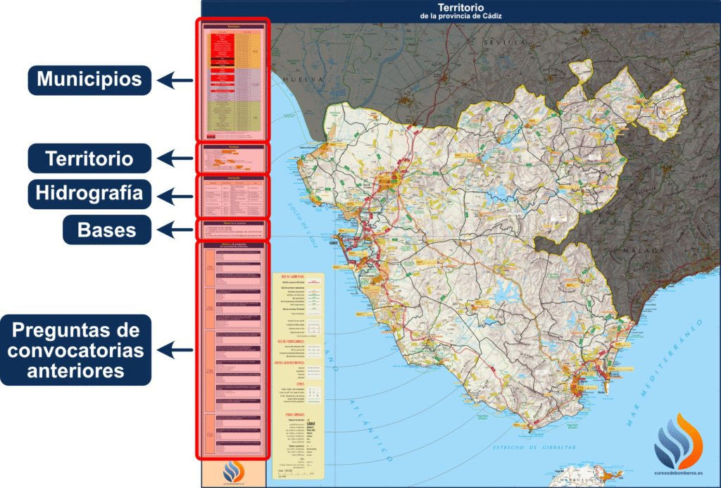 Se pone a disposición de los aspirantes un mapa provincial completo, que recoge los límites de los términos municipales, los núcleos urbanos y pedanías, los principales accidentes hidrográficos, sierras y picos más relevantes, así como la ubicación de los parques de bomberos, playas y, muy especialmente, las carreteras nacionales, autonómicas y locales, indicando en cada caso su matrícula, denominación oficial, punto de inicio y punto final.