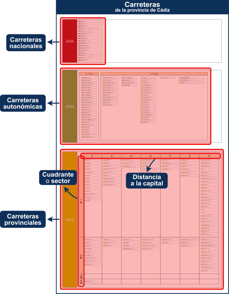Asimismo, el mapa se complementa con una división por cuadrantes, herramienta esencial para dominar las carreteras provinciales, cuya numeración responde a la distancia respecto a la capital y a la posición geográfica dentro del cuadrante correspondiente.