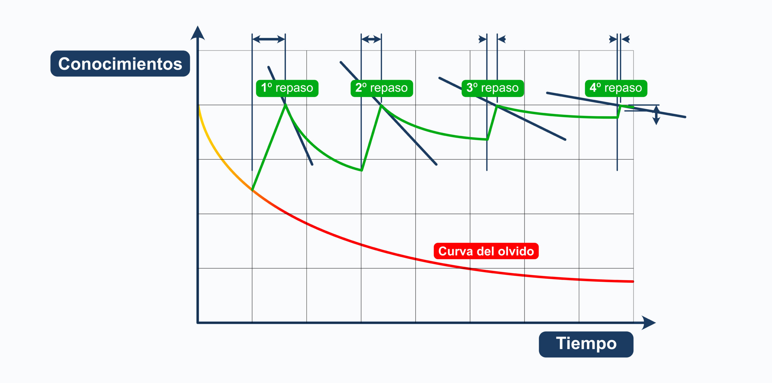 Existe una curva del olvido por cada tema. Para contrarrestar el efecto del olvido y mantener los conocimientos adquiridos, es fundamental implementar repasos regulares y contantes.